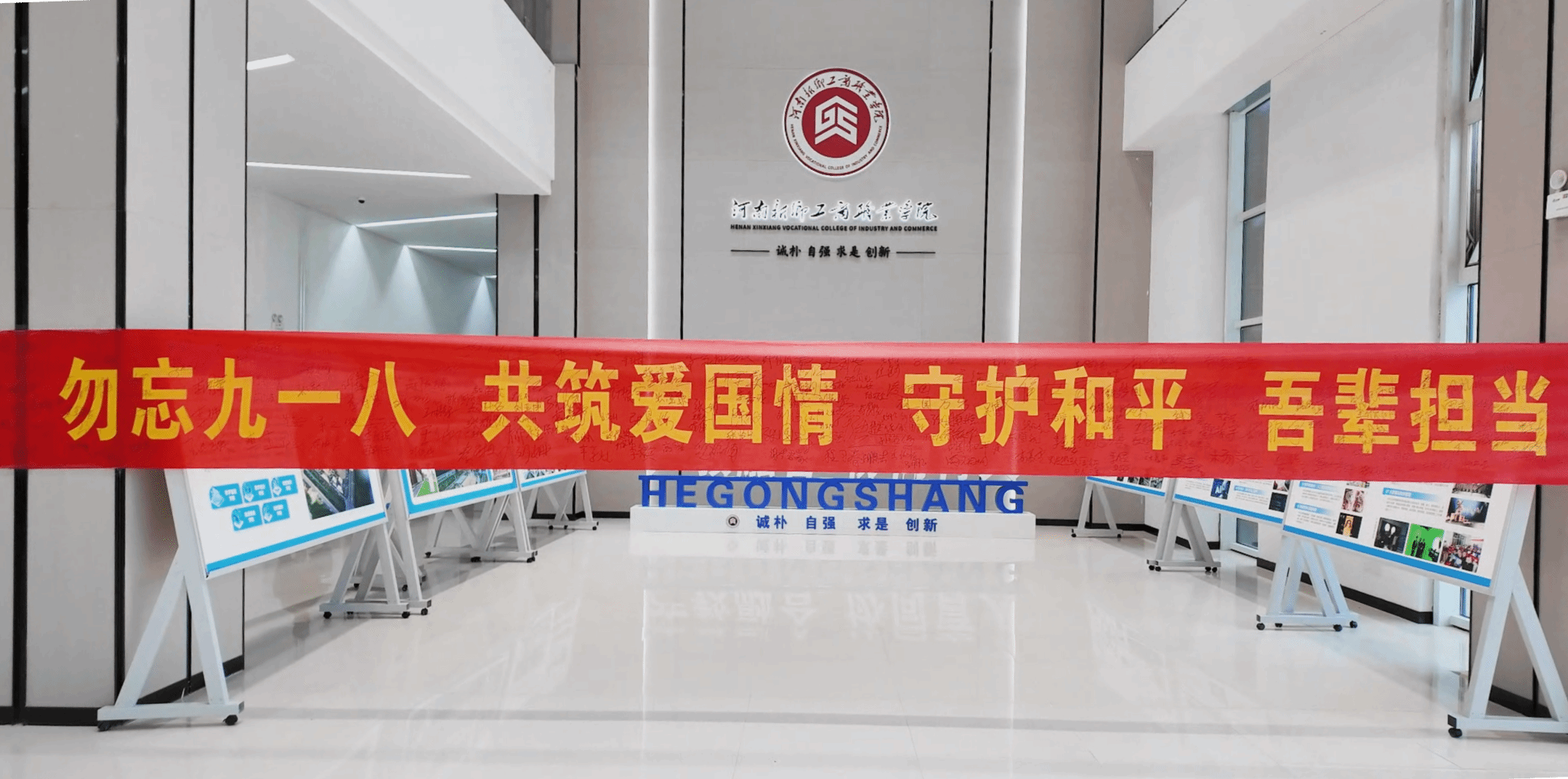 影片放映结束后,全体师生移步自强楼一楼大厅举行主题仪式。印有“勿忘九一八 共筑爱国情 守护和平 吾辈担当”字样的红色条幅庄严展开,